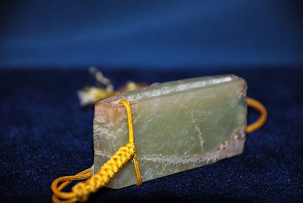 本件為早期取得,少不更事,遂綁繩結隨身盤玩。但如今對高古玉器不敢再如此輕待,深怕一不小心又毀損一件二千餘年的文化寶物。