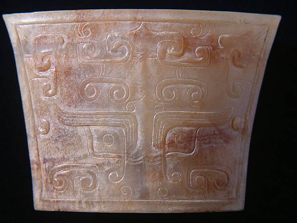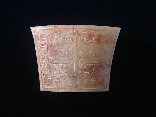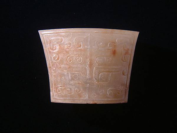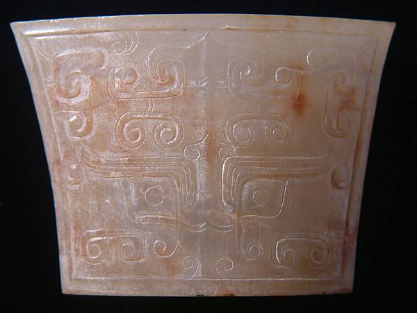 戰漢白玉饕餮紋劍珌。和闐白玉質,玉理中有三、四道橫向的水波紋,器表大部分均受褐沁。本件劍珌主紋飾為饕餮紋,但此饕餮紋少了常見長長的角,頭上卻多了「介」字型的頭蓋,正中琢出一上下貫穿的凸稜。其他較空白的位置,以陽紋和陰紋的雲頭紋或雲氣紋填補,兩面紋飾相同。本件劍珌的陽紋以非常成熟的「壓地隱起」手法雕琢而成,紋飾其實並不深刻,但仍讓人看起來凹凸有致。