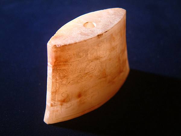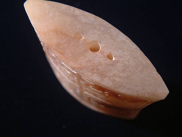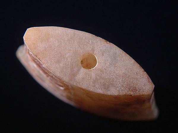 上緣較寬的一端鑽有三個孔,中間一個直徑約0.35cm,兩旁各斜斜地鑽了0.1cm直徑的小孔,兩小孔後端鑽入中間較大的孔,此三個孔洞應該是穿絲繩,綁上流蘇等飾物之用。