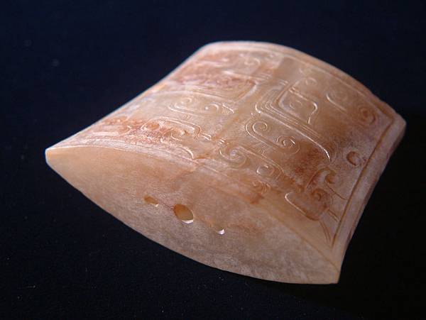在劍珌上緣鑽孔繫上流蘇等飾物,似乎在玉劍飾中較為少見,再加上這劍珌較小,或許這是件女性用的短劍劍飾吧?雖然戰國和西漢均有饕餮紋飾,但此饕餮紋較接近西漢初期以前的模樣。