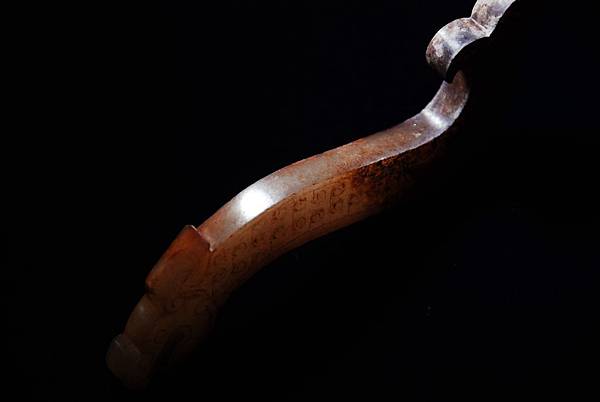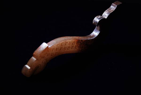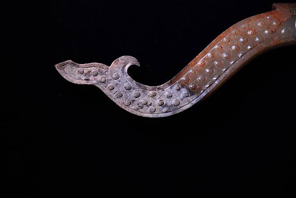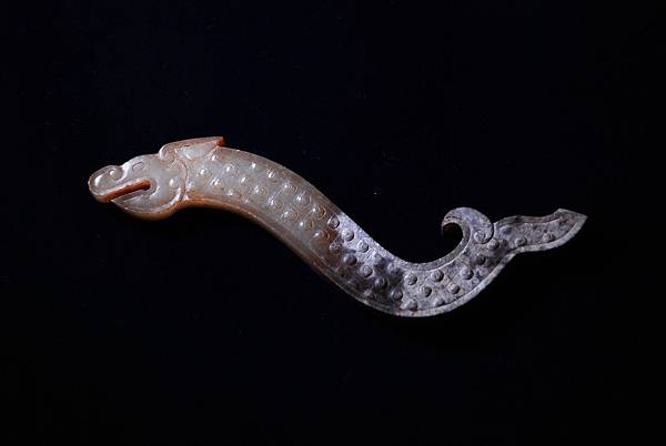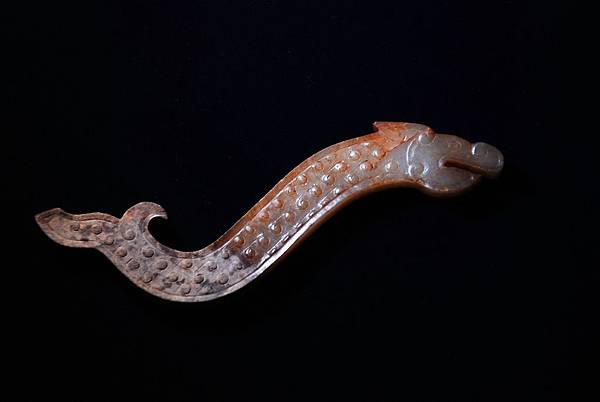戰國白玉鐵沁勾連穀紋龍。和闐白玉質,全器受鐵沁,下半身沁蝕嚴重,玉理已呈失透狀。橢圓眼,張口無牙,羽紋耳,身體紋飾為勾連穀紋,雕琢工整。斜坡邊廓紋。為戰國組配中的一件。