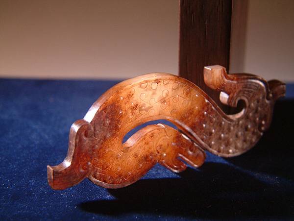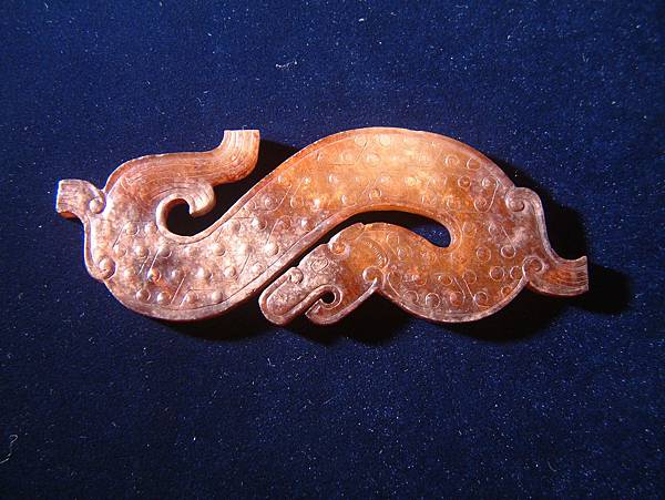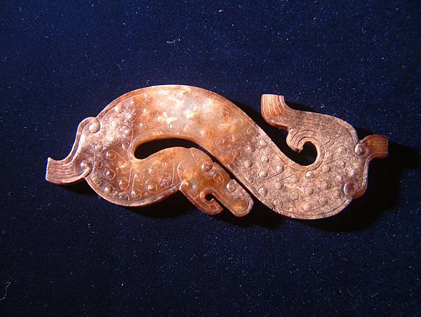 戰國中後期白玉勾連蒲紋龍形珮,和闐白玉質,受鐵質沁擾,大部分器表呈褐色,沁擾較重處已漸呈白化。陰線琢橢圓形眼,琢腮毛區格頭部與身體,全身滿飾勾連蒲紋,胸前、下腹琢鰭狀足,分岔鰭狀尾。全器周邊琢斜坡邊廓紋。