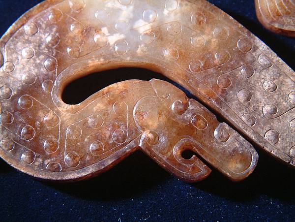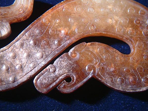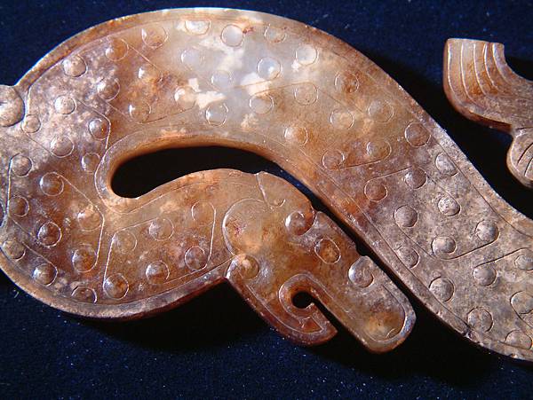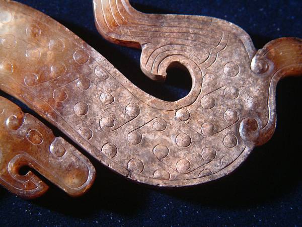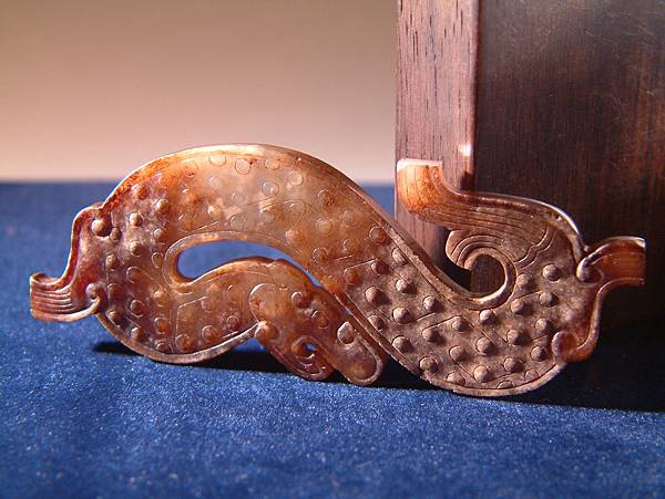 本器為戰國中後期風格,應為組珮之一。同期片狀器較有牽就片下玉塊後,就其形設計主體紋飾之特色。