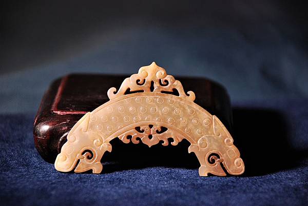 上圖為1950年河南省輝縣固圍村的戰國中期魏國王室墓祭祀坑出土玉器,該件紋飾已經非常接近本件紋飾。同坑另有一件更精緻的玉珩,除了沒有出括的上下鏤雕紋飾之外,幾乎與本件紋飾完全一樣,可惜網路上找不到該件照片。