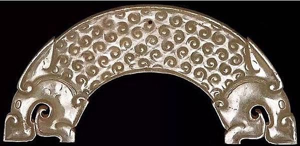 戰國白玉龍鳳穀紋珩。和闐白玉,部分末端玉質略有白化質變,主體部位玉質較為潤透。本件珩兩端為龍頭,中段雕琢穀紋,上緣外廓為雲氣紋,中間鏤雕豎孔可穿絲繩配戴,下緣外擴鏤雕相對的簡化鳳紋以做裝飾,亦可穿絲繩向下連接其他玉珮成為組珮。兩面紋飾完全一樣。