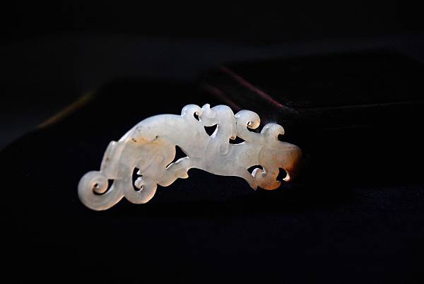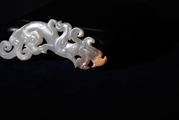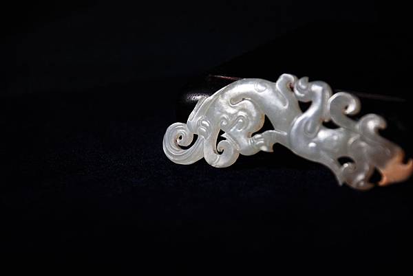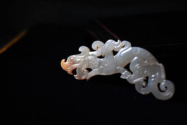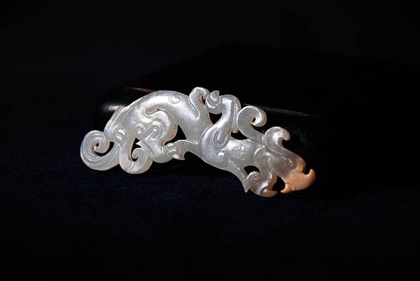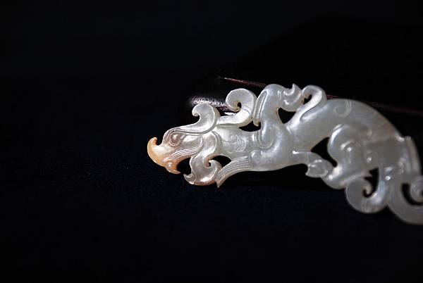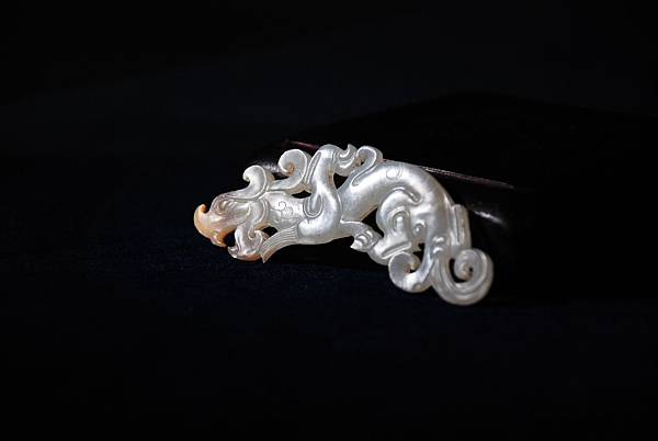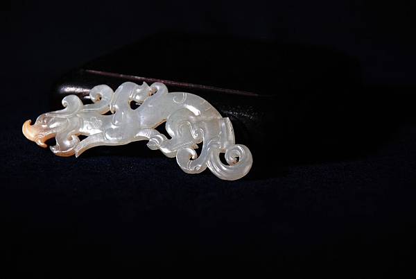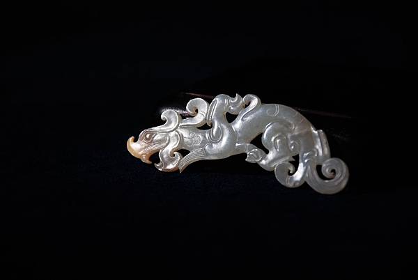 西漢白玉龍珮。和闐白仔兒玉,玉質堅硬,輕敲「鏘鏘」有聲,鼻頭有一淺褐色區塊,為玉皮皮色。本件雕琢一勾身騰躍的螭龍,勾鼻,棗形眼,張嘴露齒,嘴上琢有髭毛,頂上兩道向上卷曲的角,頸部用極細陰線琢出仙花,肩下琢一撮毛紋,前爪高高揚起似欲攻擊狀,背上三、四道陰線旁再琢出更細的短毛紋,分岔絞繩尾,後肢之一攀附在尾部上,整體具躍動、兇猛的氣韻。可作組珮中的一件,亦可單獨配戴。