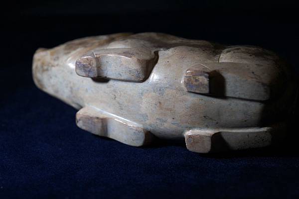除了身軀各部器官之外,只有在四肢根部肌肉部位使用曲線與身軀分隔開來,其他無西漢常用的紋飾。既無神異紋飾,故本件應是日常為人使用之物,而其重量較重,不適合隨身把玩,最合理的用途就是蓆鎮了。印象中本件與2017年8月28日上傳的「西漢白玉坐豬鎮」是一起購藏的,玉質、重量、雕工相近,可能是同坑出土之物。