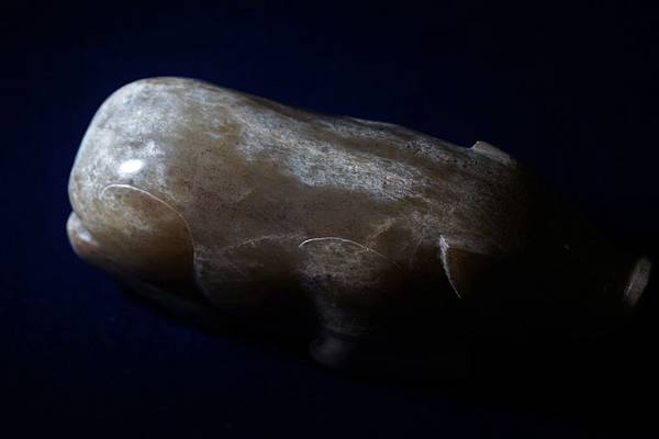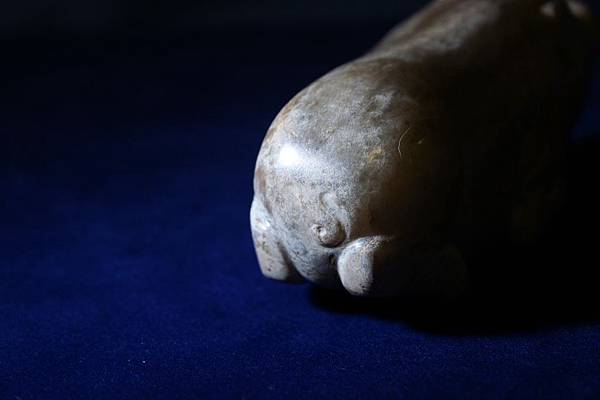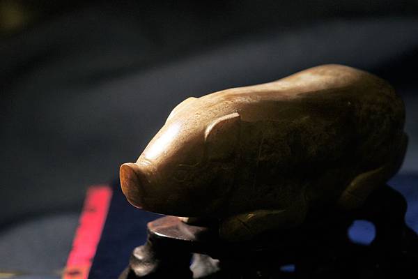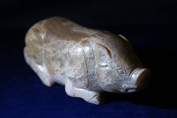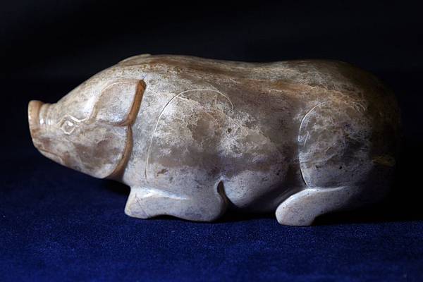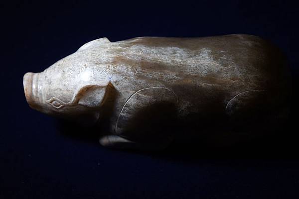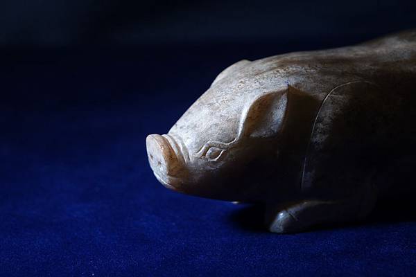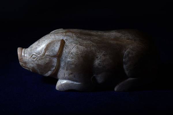 西漢青白玉豬形鎮。和闐青玉,可能入土受壓,玉理出現一些釁裂紋,器表附近的玉理受到土沁,也出現一些斑紋,看起來很像山豬的自然毛色。軀體下緣受沁成灰皮狀,右腳有較明顯的台階現象。本件雕琢一趴臥的大豬,軀幹肥大,四肢壯碩,高聳的鼻頭,肥頭大耳。本件把大豬的體形忠實地雕琢了出來,再配合其自然天成的受沁皮色,頗為逼真。本件較重,應為蓆鎮。