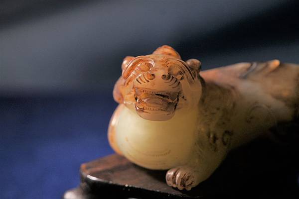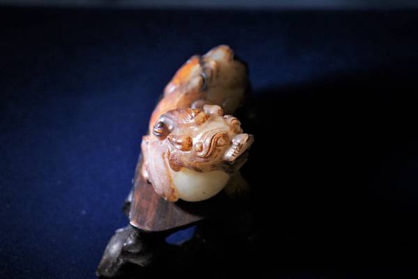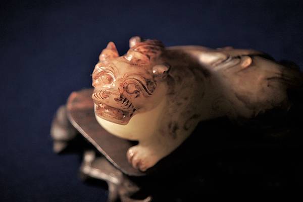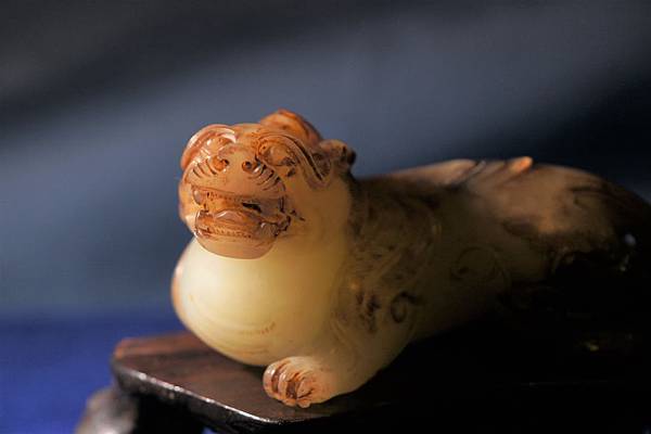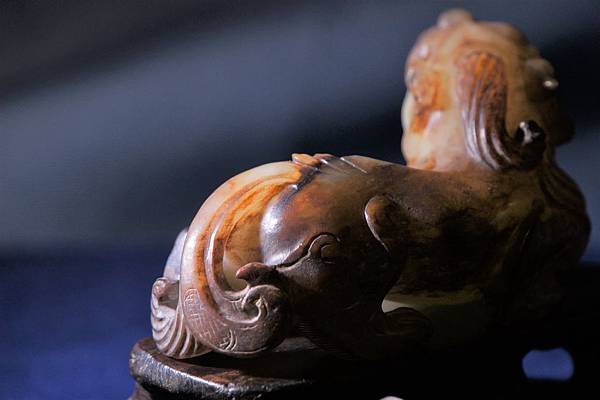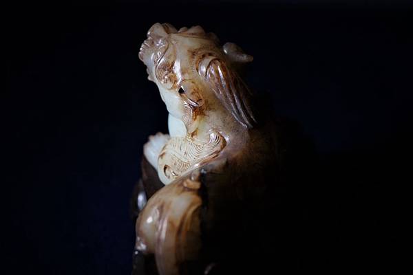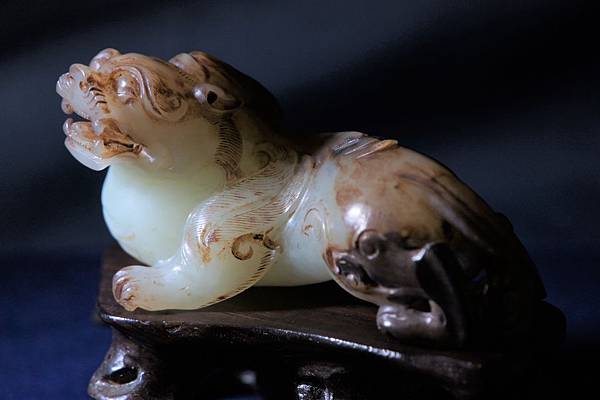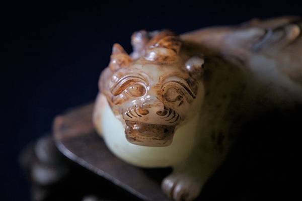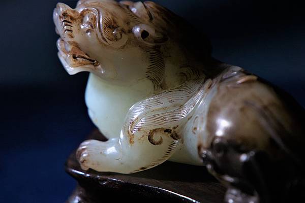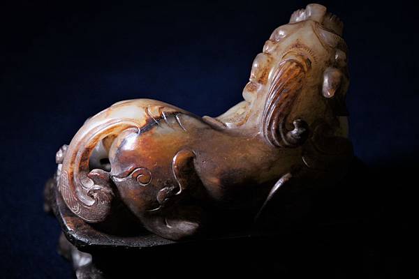 西漢青白玉褐沁天祿。青白色仔兒玉,身軀右側與左後足有黑褐色沁,尤其左足外側的沁擾已使得玉質質變,形成台階現象。本件天祿棗形眼,粗眉後捲,平吻,張嘴露出獠牙,後掠耳,絞繩紋單角,腮毛張起。胸前琢出四道皺褶,每道皺褶下緣均琢出一排短陰線,代表身上的短毛。雙肩各長出兩道長翅紋,上面均琢出滿滿的細陰線,代表翅膀上的長毛。背脊後段近尾巴處有三道V字型的皺褶,每道皺褶邊緣亦切琢細陰線。四足均粗壯有力,均琢出四指勾爪。尾巴分岔,左側小分岔仍用絞繩紋處理。本件為西漢中期的陳設器或是蓆鎮。