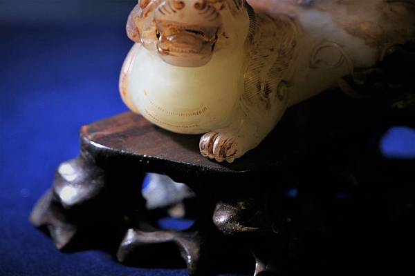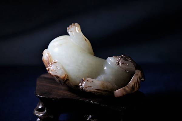 玉質極佳,可清楚看見仔兒玉的團絮狀結晶。左足外側的沁擾重,形成明顯台階,已不能透光。本件略有遺憾的是腳底的肉墊僅用兩道彎彎的粗陰紋就交代了,西漢前期較大的神獸,腳底肉墊可不馬虎,均會雕琢出如同真獸凹凸有致的肉墊。如果有格友有幸能接觸西漢前期的神獸,其腳墊能像真的野獸般,大概都會是精品,要立即下手。