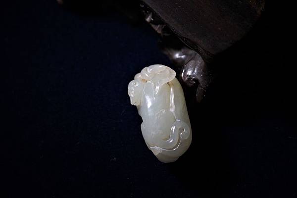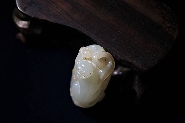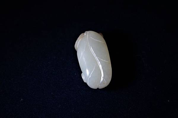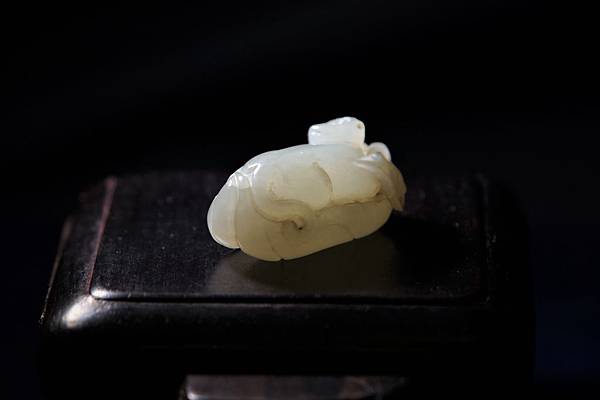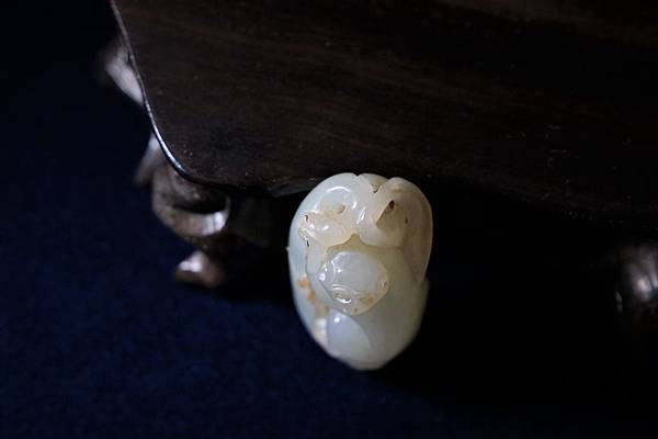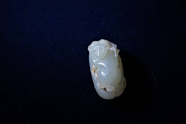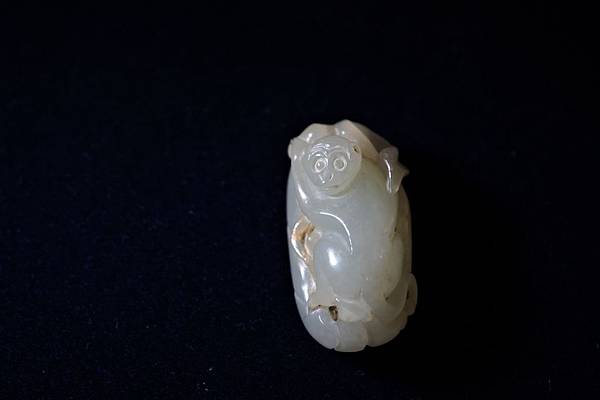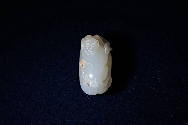 本件是將一小塊仔兒玉打磨去皮,一面就依原石形狀雕琢為桃葉,另一面則雕琢小猴。仔兒玉最緻密的玉質就像本件桃葉內看到的絮狀般的狀態,過去大家喜歡用「燉蘿蔔紋」來形容。
