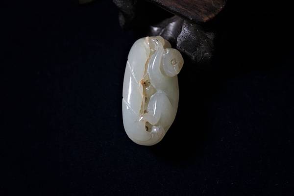 清代仔兒玉望侯佩。和闐仔兒玉,有釁裂紋。本件雕琢一隻小猴攀附在一片大桃葉之上,回頭遠望。本件為小件佩掛玉飾,卻能將小猴雕琢得栩栩如生。猴與桃此二種元素常常一起出現在玉雕上,取的是猴子偷桃獻壽之意。而本件雖然有小猴也有桃葉,表面上也有獻壽之意,但小猴遠望,卻有隱晦「望侯」的意思,是做官人的一個小心思。但此件望侯小了些,估計原主是個小官吧?