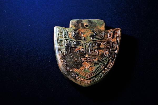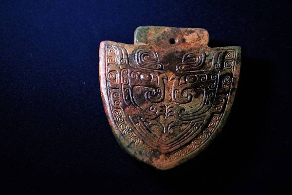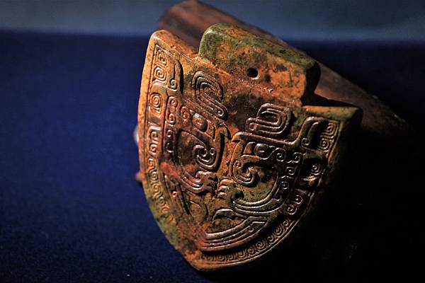 戰國青白玉銅綠鏽饕餮紋劍珌。和闐青白玉,全器受銅沁顯得色彩斑爛,沁染的銅鏽已形成厚厚的一層,無法透光。只有接頭的孔洞上方有一小塊約0.4公分平方的開窗,沁染較薄,仍能透光看到原本青玉質。本件劍珌為盾形,兩面紋飾相同,主紋飾饕餮紋,周邊雕琢渦卷的雲氣紋,但用的是剔地陽起(或稱壓地隱起)手法,把主紋飾的饕餮浮凸起來。本件陰紋深刻,下刀非常精準,陰紋間的陽紋凸起幾乎不見崩損,這得是高手才可能做得出來。本件為早期玉劍飾,可能還未形成整套部件規格,且與戰國中後期開始流行的梯形劍珌明顯不同,可能為戰國較早期的玉劍飾。