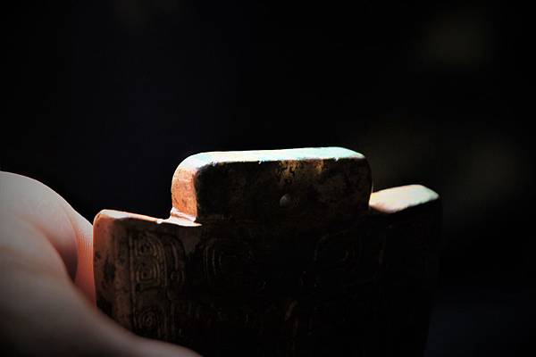 Wake購藏本件之後剛開始是把它當作紙鎮使用,若不是後來發現有那麼一丁點的開窗,才知道是青白玉質,之前還真以為本件是金屬鑄造的。
