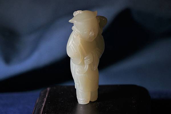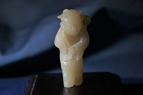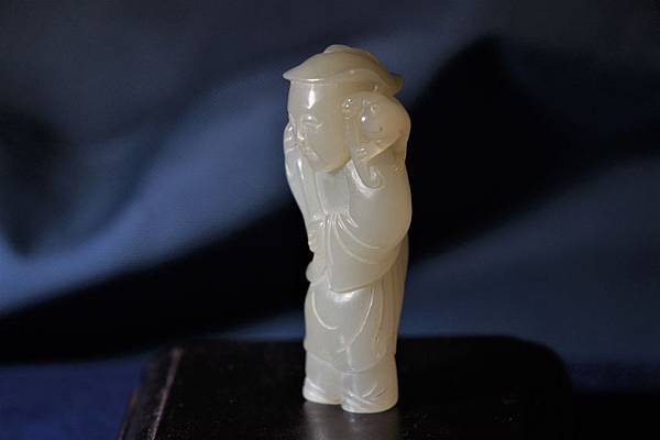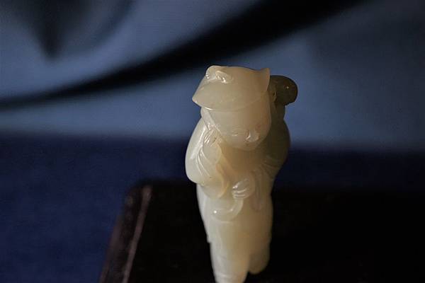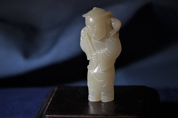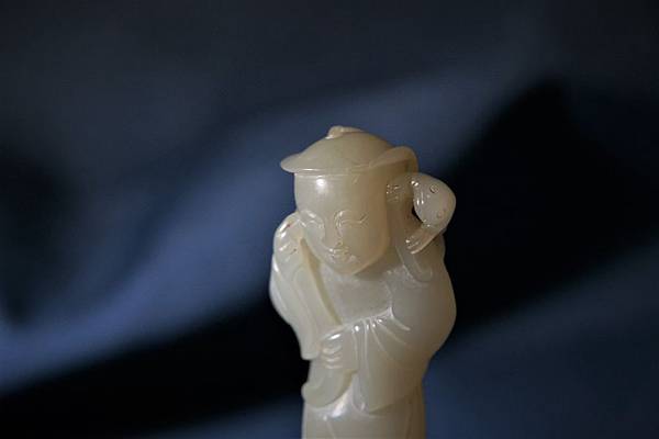 元明青玉戲蟾童子。和闐青玉。本件雕琢一小童戴著大帽,左肩上趴伏著一青蛙或蟾蜍,抓著一條繩子,繩子繞過童子後頸、右肩向前延伸,童子兩手也握著這條繩子,似乎代表童子接到了青蛙或蟾蜍的氣了。小童面帶笑容,衣袂、皺褶自然,寓意討喜,是元明吉祥寓意的玉器。童子右手持繩與右肩間有一孔洞,可繫繩隨身佩帶。