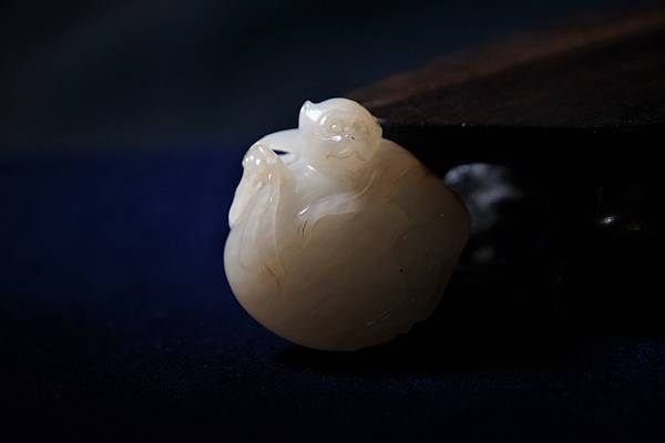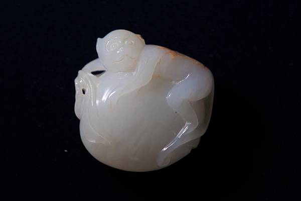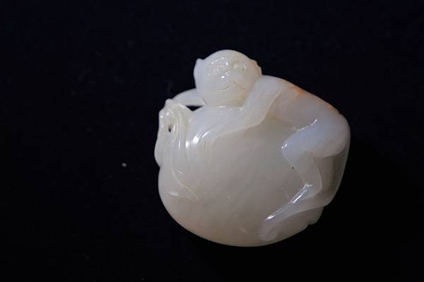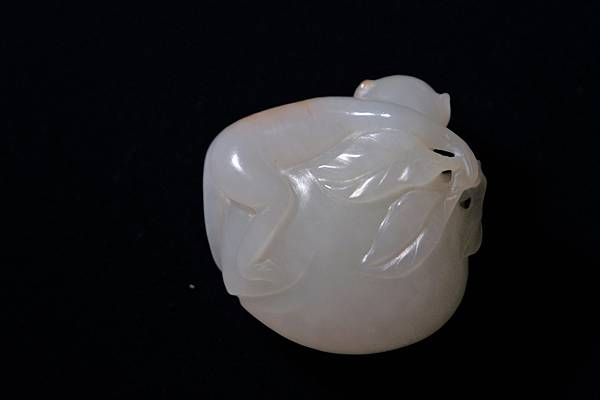 近代白仔兒玉靈猴獻壽珮。和闐白色仔兒玉,帶皮色,玉理有明顯的水波紋。雕琢一隻靈猴抱著一個大桃子,神情略顯緊張,似乎在警戒著這麼大的一顆大桃子可別被別人搶去了,有祝壽、祝福長壽平安之意。桃子枝梗雕琢四片大大小小的桃葉,浮起的枝梗可以穿繩,本件可作為吉祥珮飾珮帶。